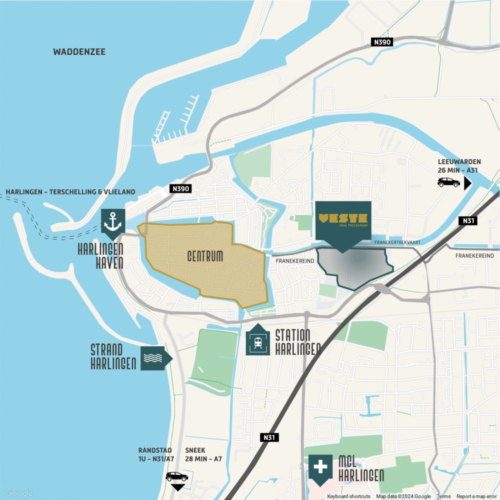 Vanaf jouw nieuwe woonplek in Veste heb je de binnenstad van Harlingen binnen handbereik. In een paar minuten fiets of wandel je naar het gezellige centrum, waar regelmatig van alles te doen is. Harlingen is een sfeervolle plaats met een dorps karakter. Je hebt er alle stadse voorzieningen, zoals winkels, terrassen en scholen, voor het uitkiezen. Tegelijkertijd heerst er een heerlijke ongedwongen sfeer van ons kent ons.